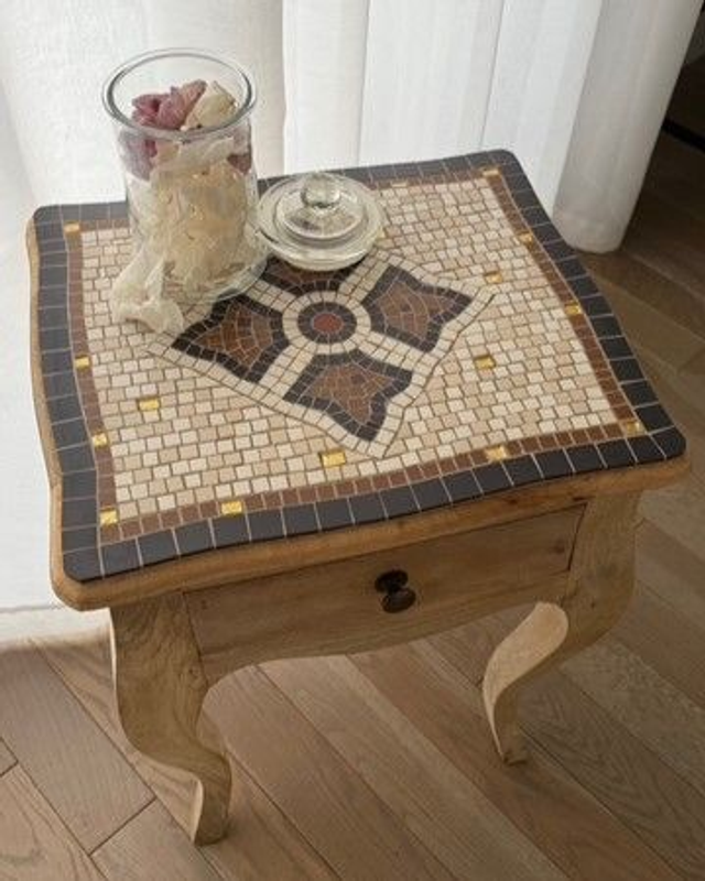 Avec son design très XVIII et sa finition vieillie, ses formes tout en courbe lui donnent une allure douce et féminine. Le chevet "Magdeleine" complètera à merveille la décoration d'une chambre ou d'un salon avec sa touche authentique et unique : sa mosaïque a été créée sur mesure.